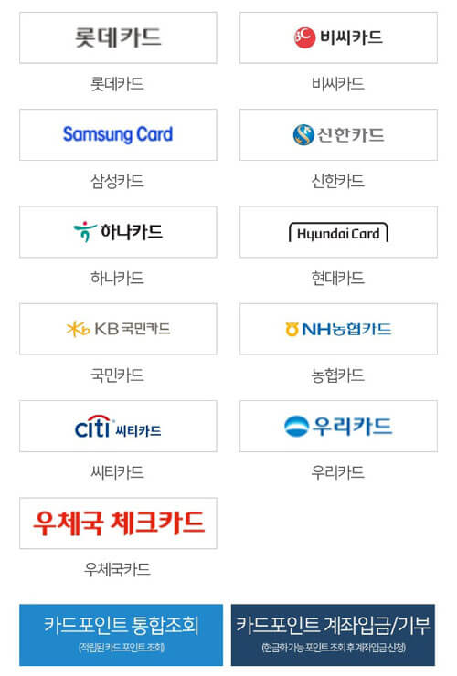 모든 카드사가 해당되지 않기 때문에 위의 이미지에 나와있는 카드사 확인 후 카드포인트 계좌입금을 진행해 주면 됩니다. 명단에 없는 카드는 해당 카드사에 직접 계좌입금 신청을 따로 해야 하는 점은 참고하시길 바랍니다.