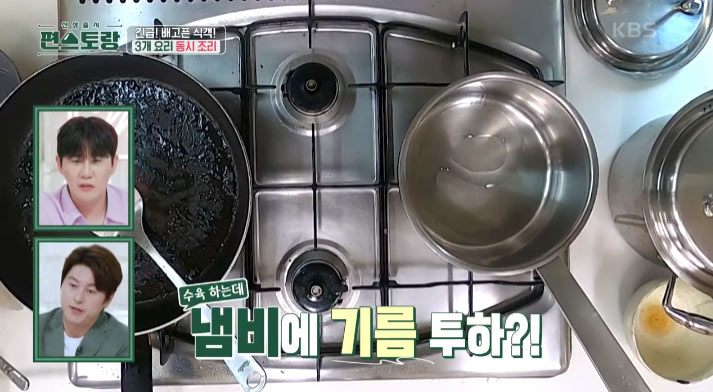 1. 냄비에 중불에서 3-4분간 냄비를 충분히 달군 후에 식용유를 한 바퀴 둘러줍니다. 식용유를 넣고 물결이 생기면 적당히 예열이 된 것입니다.